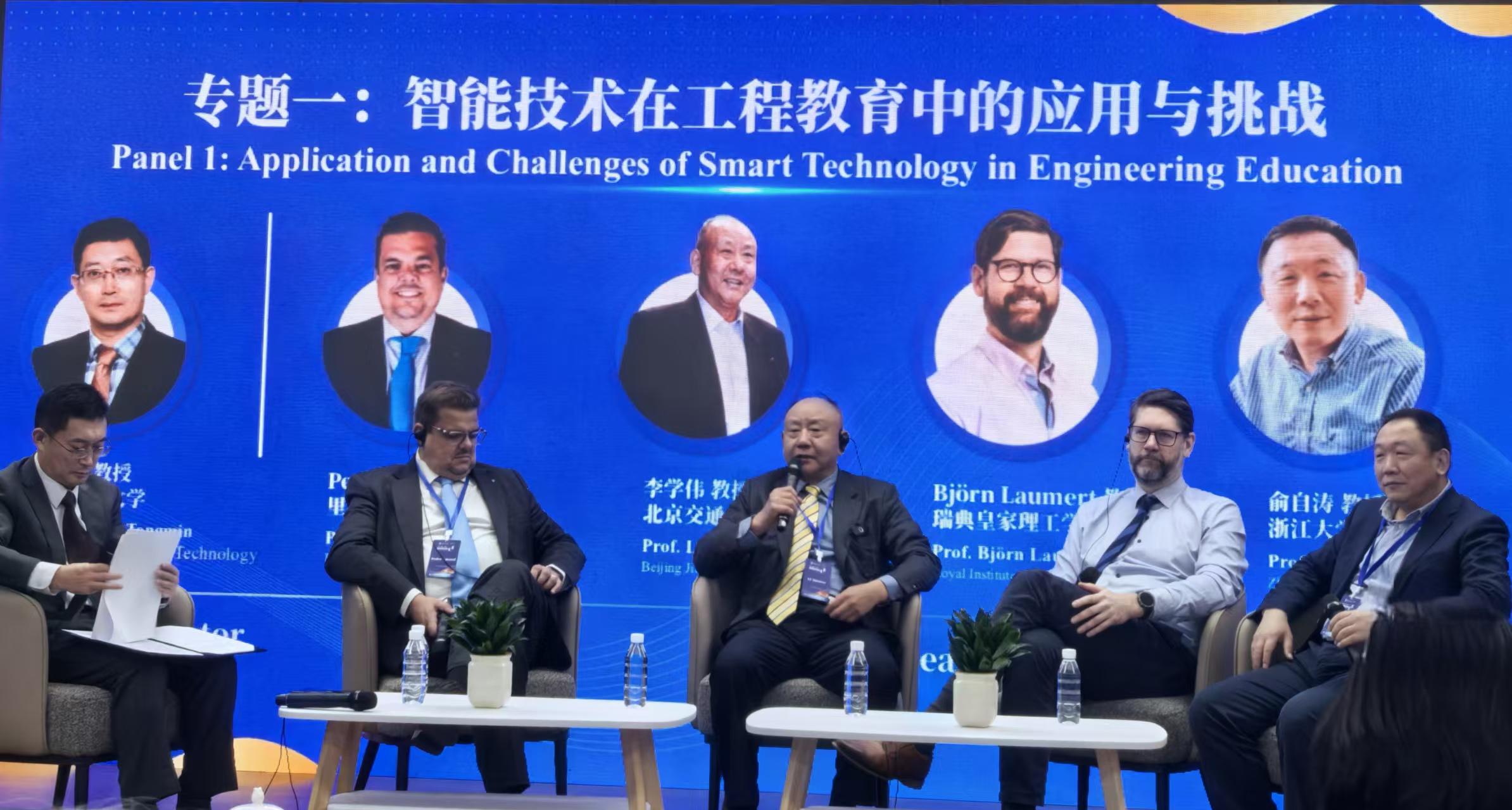 专题研讨一的主题是“智能技术在工程教育中的应用与挑战”,欧方分享嘉宾是葡萄牙里斯本理工大学副校长Pedro Amara教授和瑞典皇家理工学院Bjorn Laumer教授,中方分享嘉宾是北京交通大学李学伟教授和浙江大学俞自涛教授。